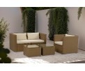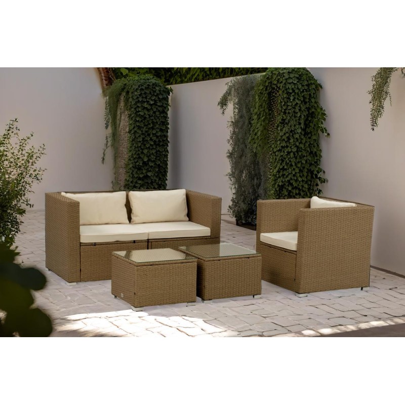 El modelo Bahamas sofá doble y sillón es un moderno conjunto modular de muebles de exterior perfecto para tu balcón, jardín o terraza, compuesto por 1 sofá doble formado por 2 módulos de esquina, 1 sillón y 2 mesas de centro, por lo que está diseñado para alojar a 3 personas.